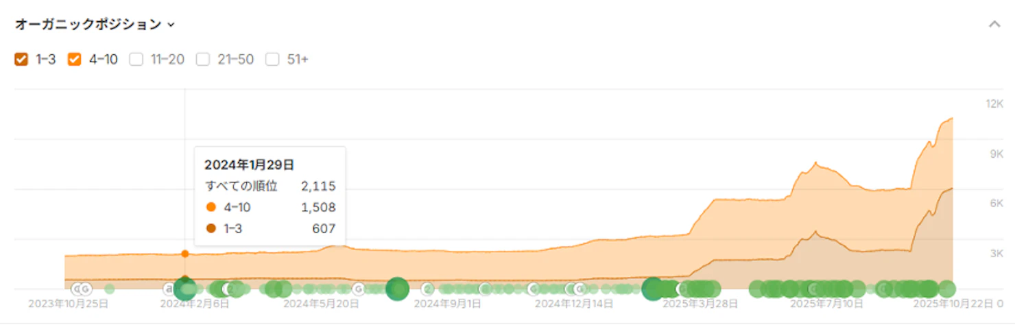 SEOツールで見ると、Google検索の1ページ目に表示されるキーワードの割合が、microCMS導入時期から右肩上がりで伸びています。2025年に入ってからは上位1〜3位に表示されるページも大幅に増加しました。コンテンツをどんどん更新できるようになったことが要因かと思いますが、このスピード感で記事を公開できるようになったのは、間違いなくmicroCMSのおかげです。